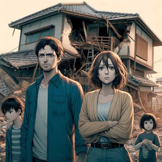 自宅が倒壊し、家族は狭い公営災害住宅で肩を寄せ合って暮らしている。